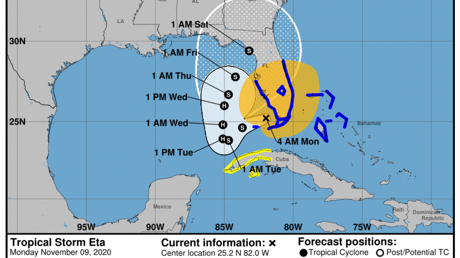 Its important to note that impacts particularly heavy rain high surf coastal flooding. Eta Path Tracker as Tropical Storm Strikes Florida No Risk of Hurricane 50 Striking Photos of Climate Disasters in 2020 Heavy rainfall from Eta. On the hurricane centers forecast track the center of the storm is forecast to move near or over some of the Florida Keys tonight and into Monday.
